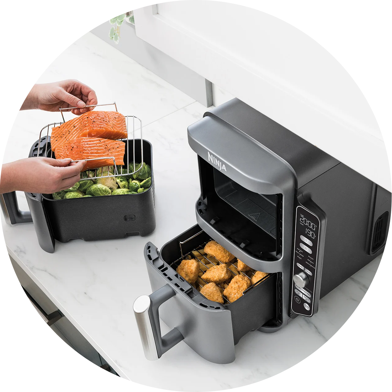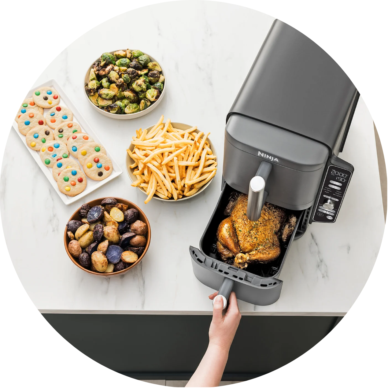 Sa grande capacité de 9,5 L permet de préparer des repas pour 8 personnes, chaque tiroir de 4,75 L pouvant contenir un poulet rôti de 1,5 kg. Avec une cuisson jusqu’à 55 % plus rapide que les fours à convection naturelle***, vous pourrez servir des plats pour toute la famille en quelques minutes seulement.