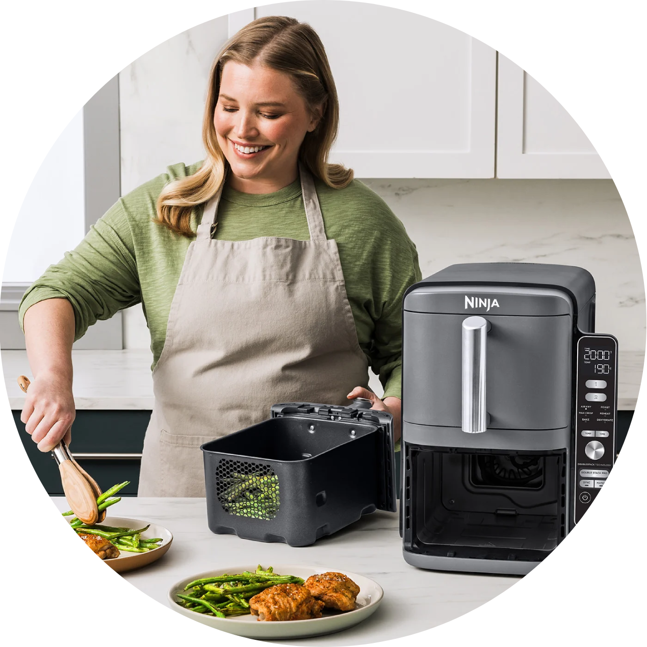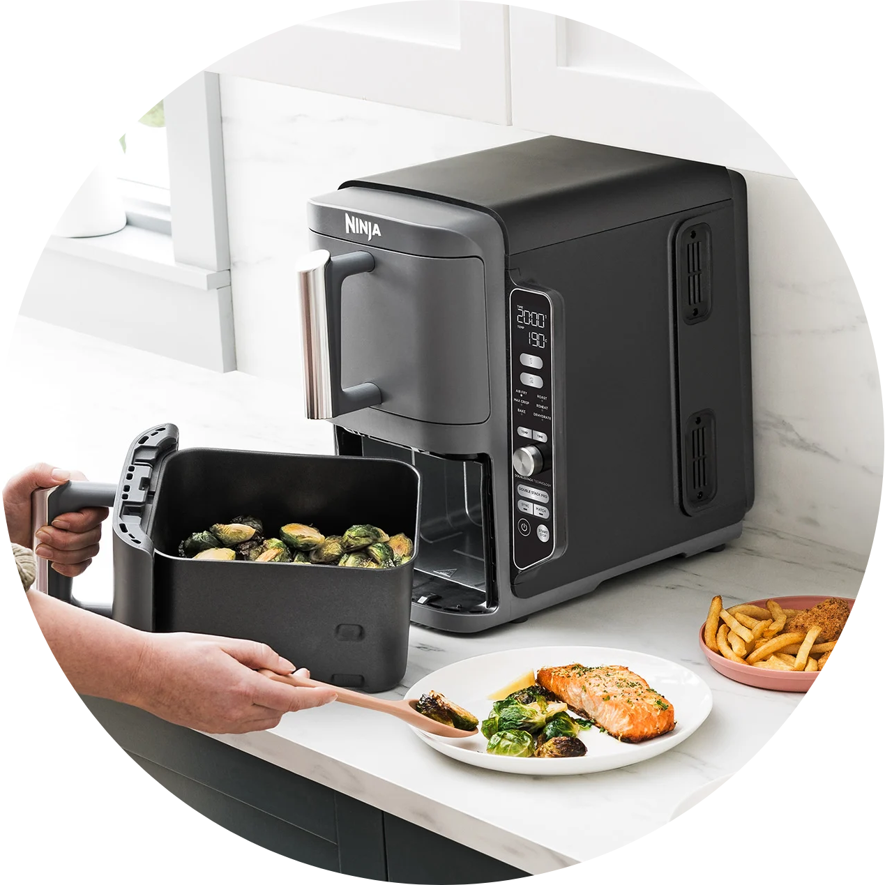 Préparez. Synchronisez. Empilez. Utilisez un mode, une température et un temps de cuisson différents dans chaque tiroir, grâce à ses 6 modes de cuisson : Air Fry (Frire sans huile), Max Crisp (Croustillant max), Roast (Rôtir), Bake (Cuire au four), Dehydrate (Déshydrater) et Reheat (Réchauffer).La fonction SYNC permet de synchroniser les fins de cuisson des deux tiroirs. La fonction MATCH permet d’utiliser les mêmes paramètres pour chaque tiroir, afin de cuisiner de plus grandes quantités.