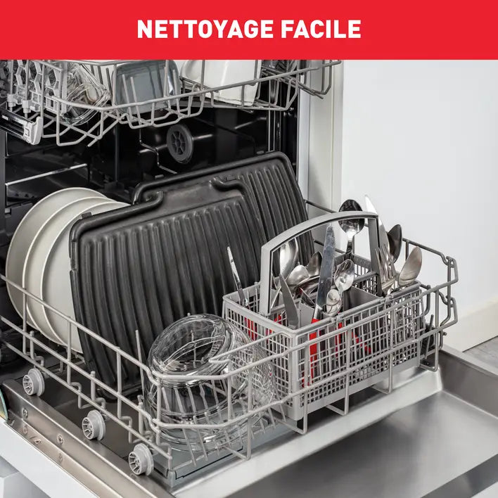 Plaques amovibles et bac à jus compatibles lave-vaisselle pour un nettoyage ultra facile.